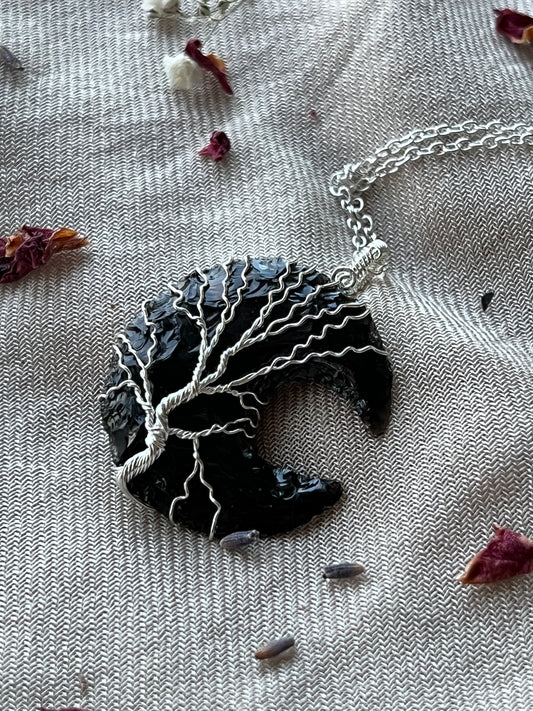 Black Obsidian Crescent Moon Tree of Life Necklaces