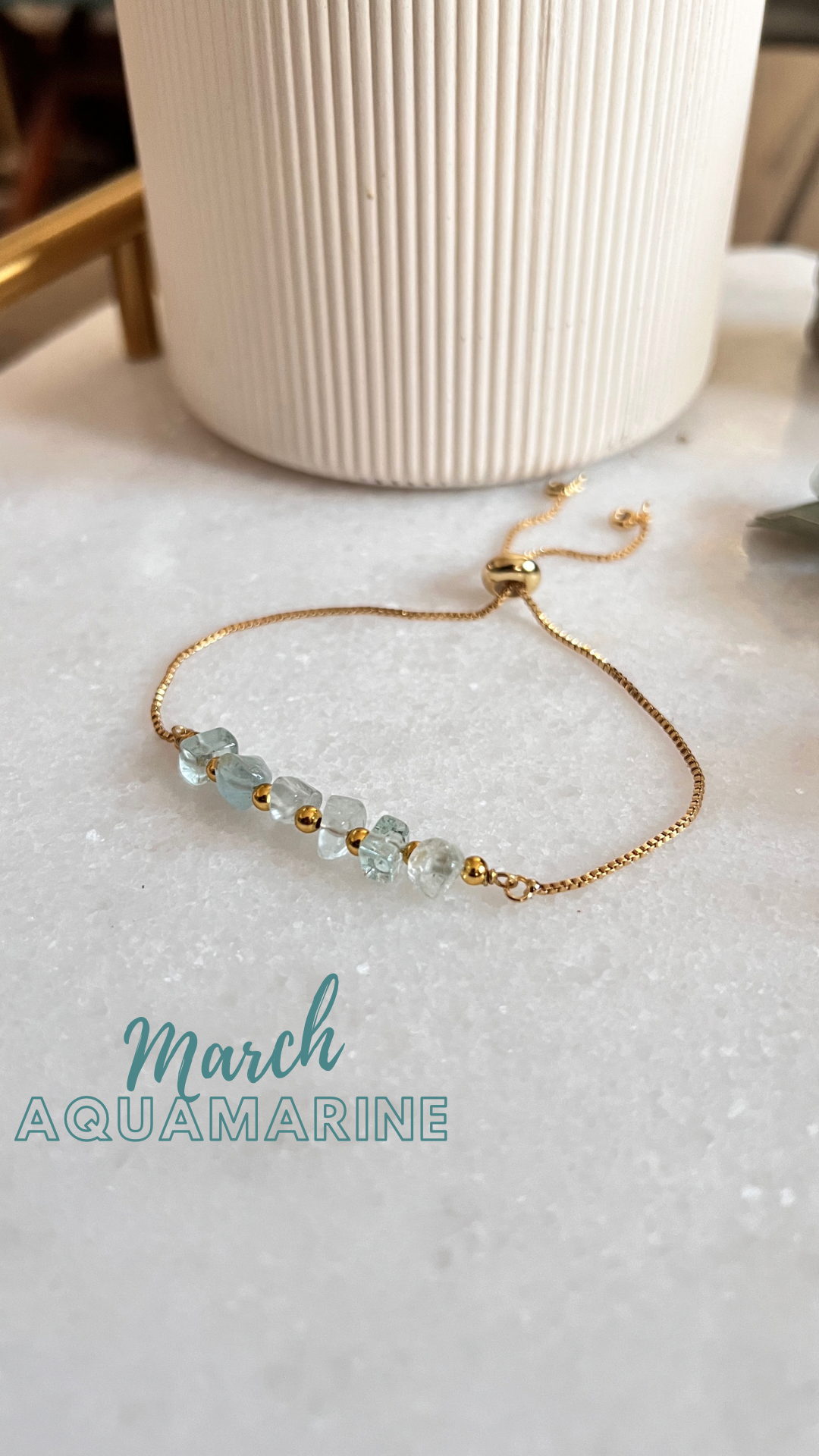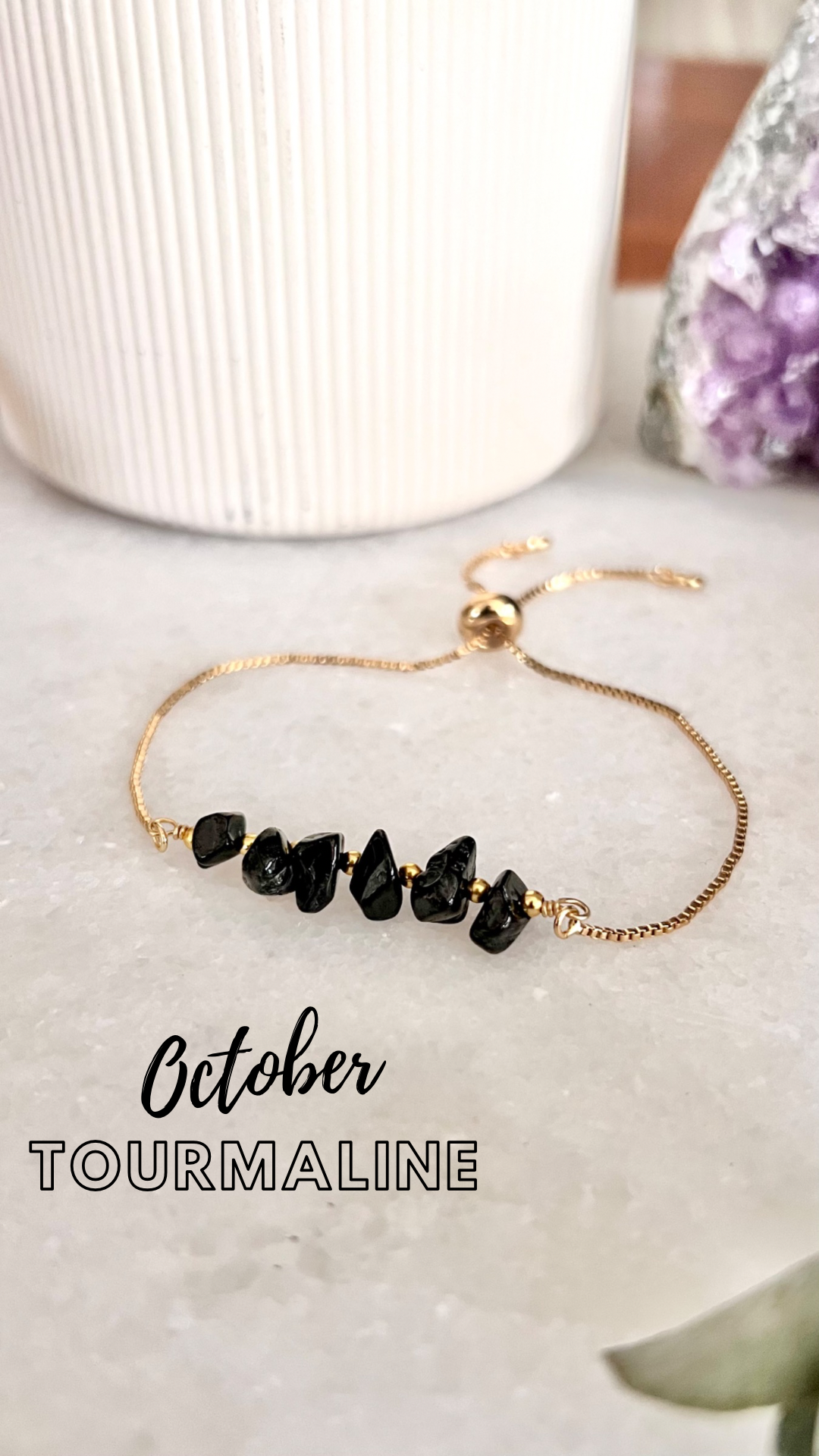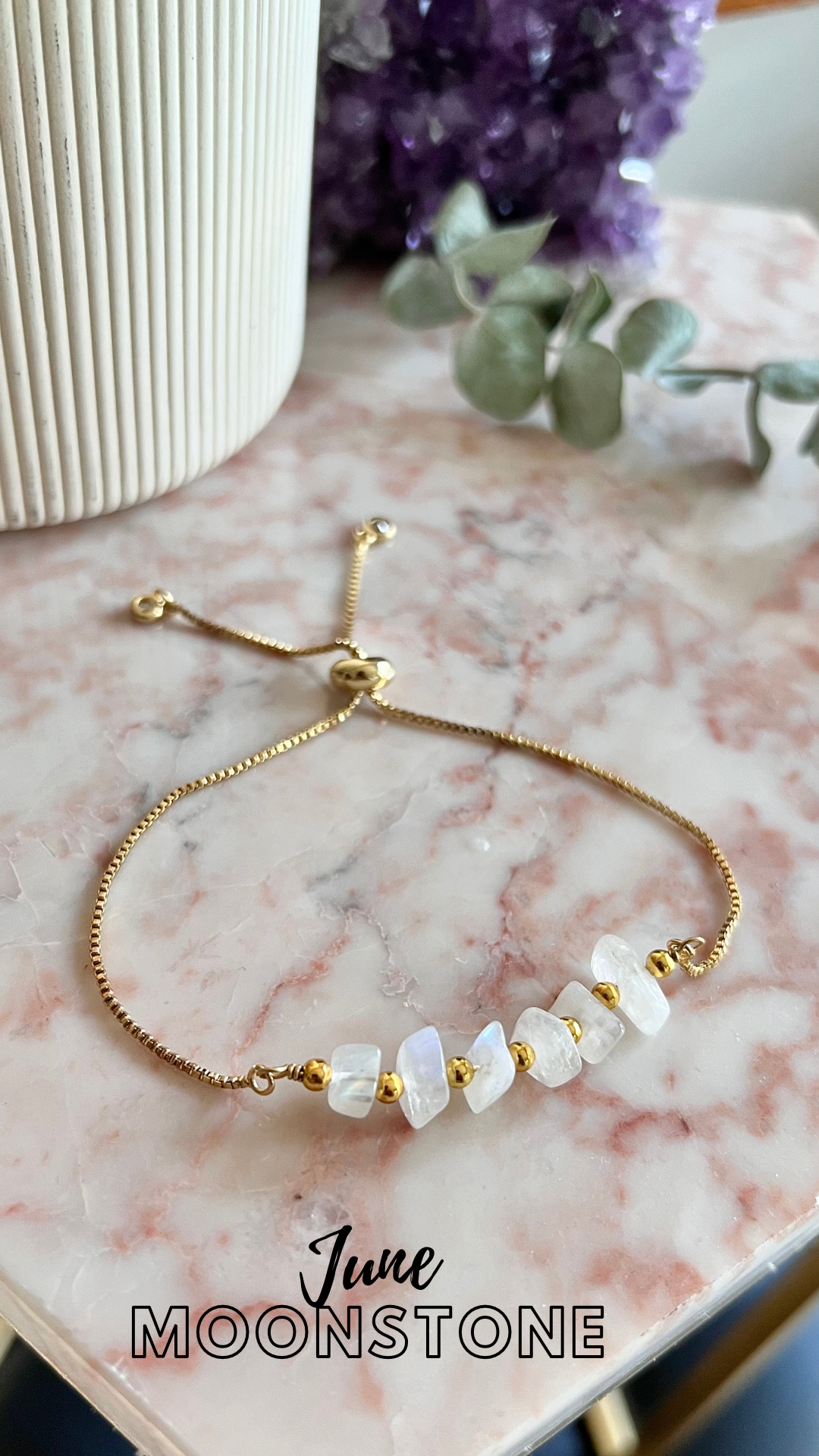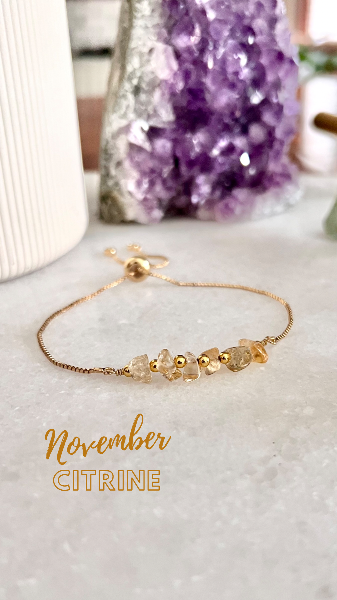 Birthstone Bracelets handmade with natural crystals and pure brass adjustable sliding chain.